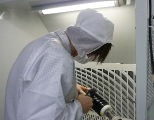| ワークの表面に残っている微細なゴミを、ブラシや除電ガンを使って除去します。 |